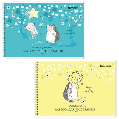 Альбом для рисования, А4 32 листов, гребень, обложка картон, BRAUBERG, 195х285 мм, "Ёжики" (2 вида),