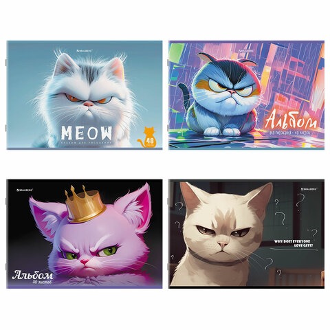Альбом для рисования А4, 40 листов, скоба, обложка картон, BRAUBERG, 203х288 мм, "Суровые коты" (4 в
