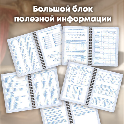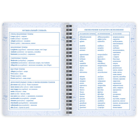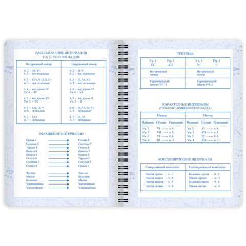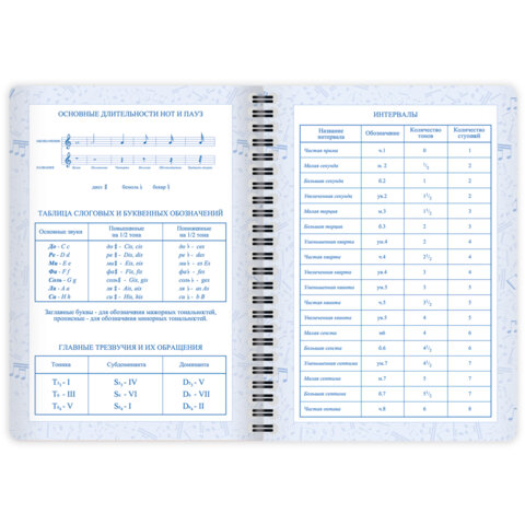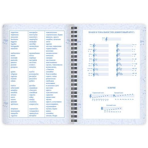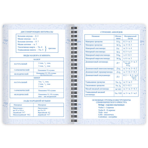 Дневник имеет надёжную двойную обложку, которая защищает страницы от повреждений. Внешняя обложка сделана из высококачественного износостойкого прозрачного пластика, а внутренняя – из плотного картона. Крепление дневника – двойной металлический гребень, он надежно скрепляет листы между собой. Внутренний блок содержит 48 листов и изготовлен из белой офсетной бумаги повышенной плотности 70 г/м2. Дневник содержит справочную информацию – длительности нот, интервалы, знаки в тональностях, ключи.