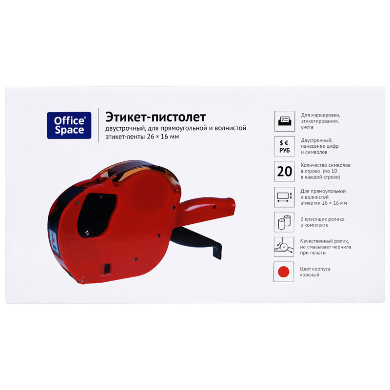 Этикет-пистолет OfficeSpace двустрочный, прямоугольная и волнистая лента, 20 символов, 26*16мм