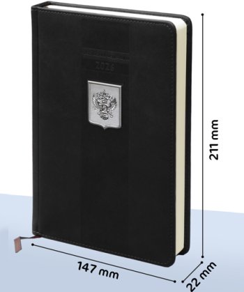 Ежедневник датированный, черный. Выполнен в классическом стиле. Обложка из экокожи высокого качества с поролоновой прослойкой, с изображением Герба. Блок: датированный, из тонированной белой бумаги высокой плотности, 170 листов, содержит справочный матери