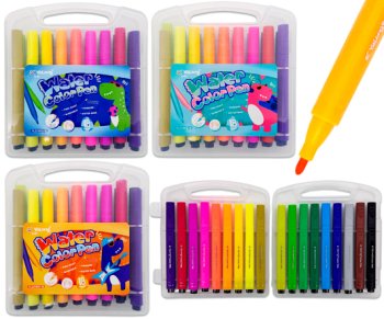 Фломастеры рисуют яркими насыщенными цветами. Чернила на водной основе не имеют запаха и легко отстирываются водой. Фломастеры не высыхают, находясь без колпачка долгое время. Очень прочный пулевидный наконечник