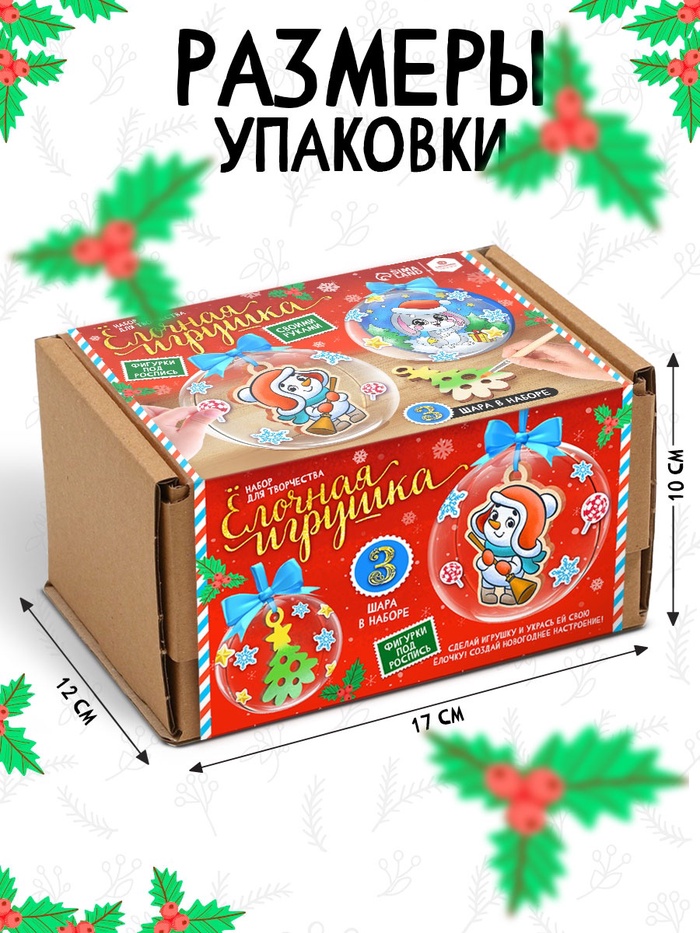Шары-заготовки: 3 прозрачные пластиковые сферы с подвесами, диаметром 9 см и 7 см. Фигурки для раскрашивания: Две деревянные основы – медвежонок в шапке и новогодняя ёлочка. Картонная вкладка: Картонная вкладка с зимним рисунком, которую можно раскрасить. Наклейки: Наклейки. Ленты: Красная лента для удобного подвешивания игрушек.