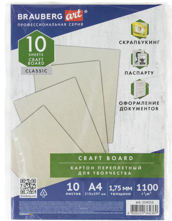 Картон переплетный толщина 1,75 мм А4 (210х297 мм), КОМПЛЕКТ 10 шт., BRAUBERG