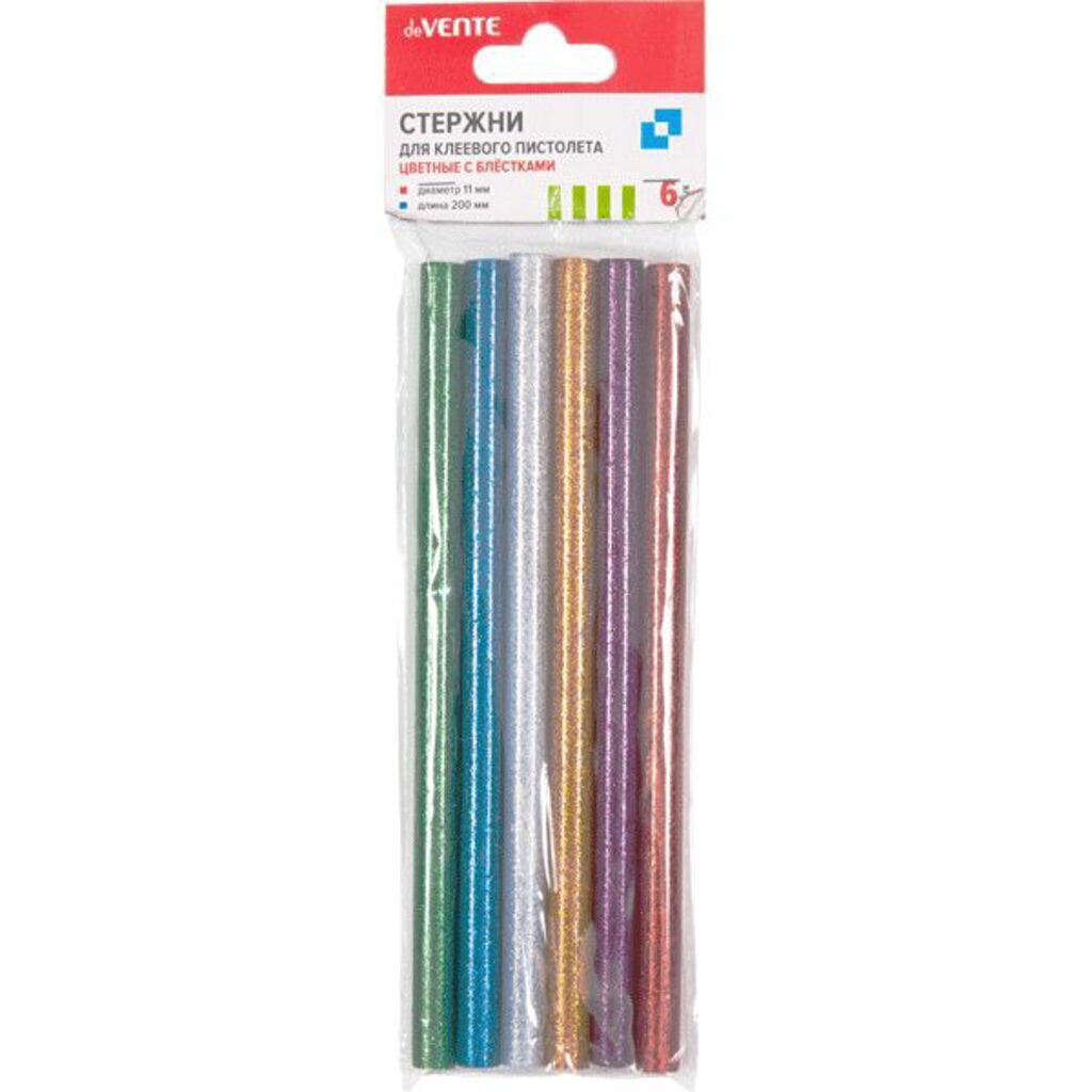 Клеевые стержни "deVENTE" ? 11 мм, цветные (ассорти), с блестками, длина 200 мм, 6 шт в упаковке c картонным европодвесом