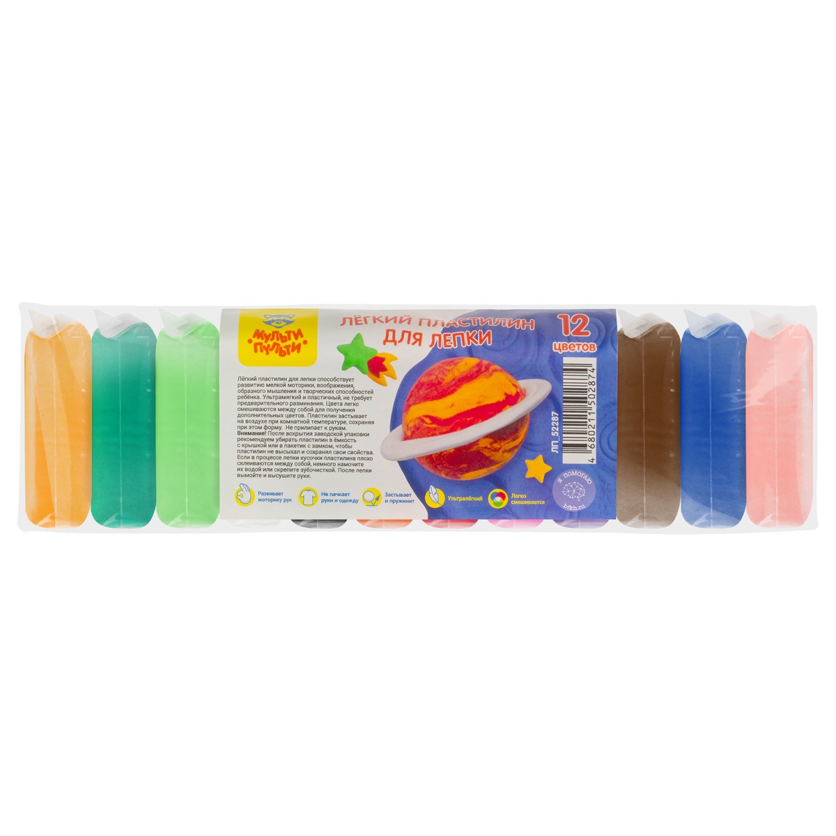 Легкий пластилин для лепки Мульти-Пульти, 12 цветов, 120г, прозрачный пакет