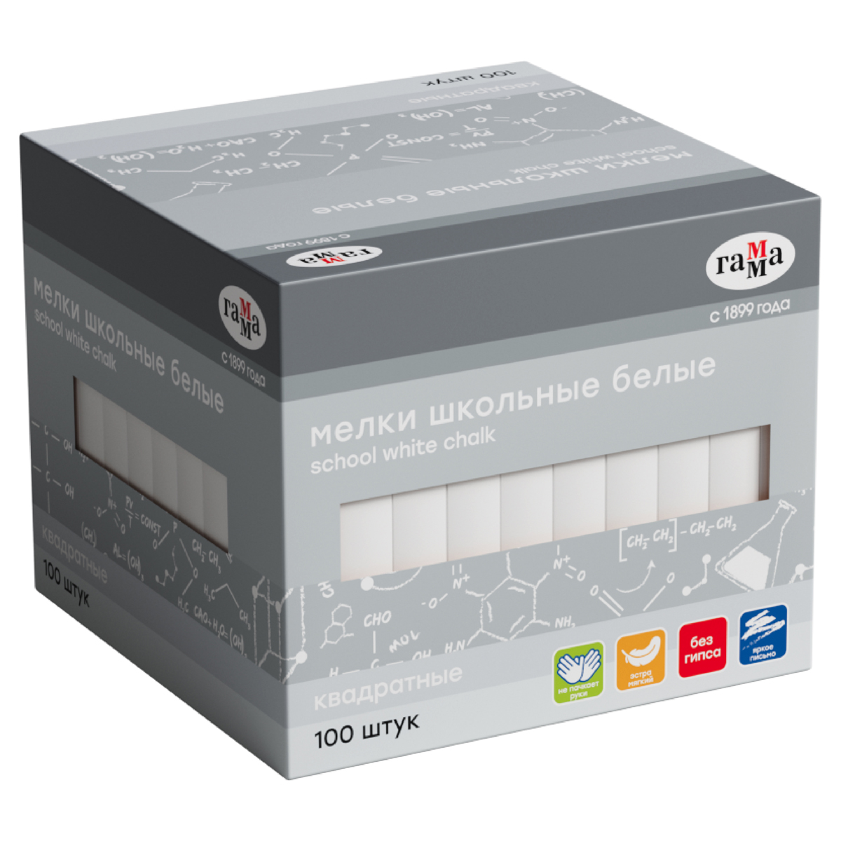 Квадратный школьный белый мягкий мел ГАММА подходит для письма или рисования на школьной доске и любой шероховатой поверхности. Длина мелка — 8 см. В наборе 100 мелков.