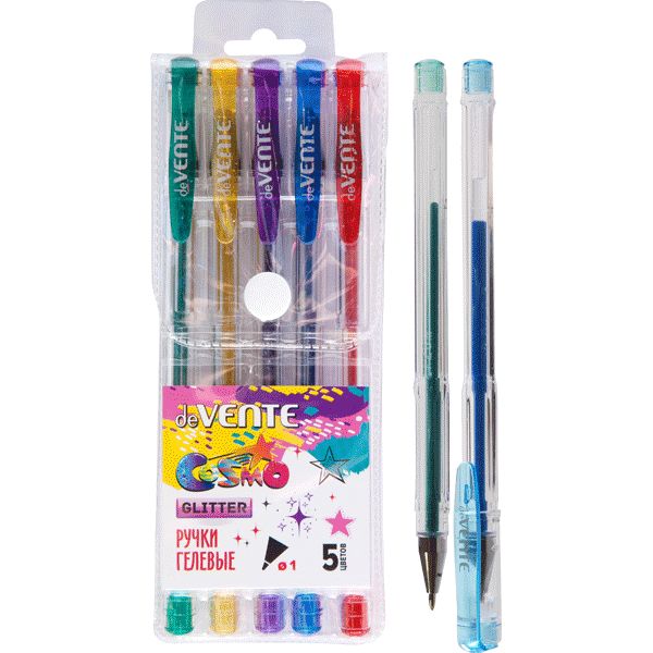 Набор ручек гелевых "deVENTE. Cosmo Glitter" 05 цветов с блестками, d=1 мм, прозрачный корпус с металлическим наконечником, сменный стержень, в пластиковом блистере