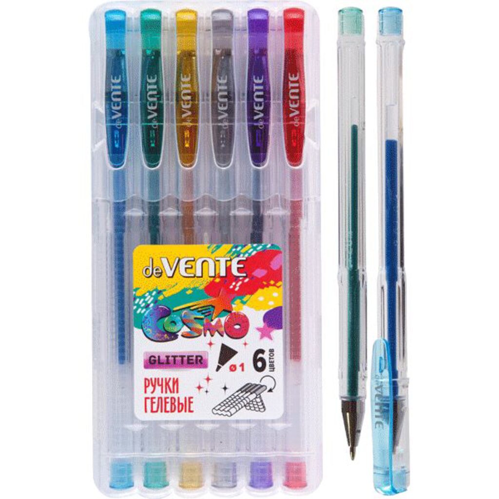 Набор гелевых ручек deVENTE 6цв. "Cosmo Glitter" с блёстками., прозрачный корпус, 1мм deVENTE