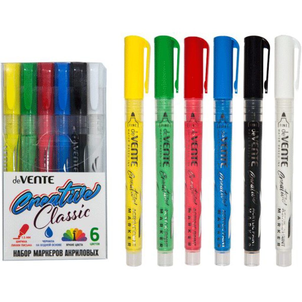 Набор маркеров акриловых "deVENTE. " 6 классических цветов, круглый корпус, пулевидный наконечник, ширина линии 1,5 мм, в пластиковой упаковке