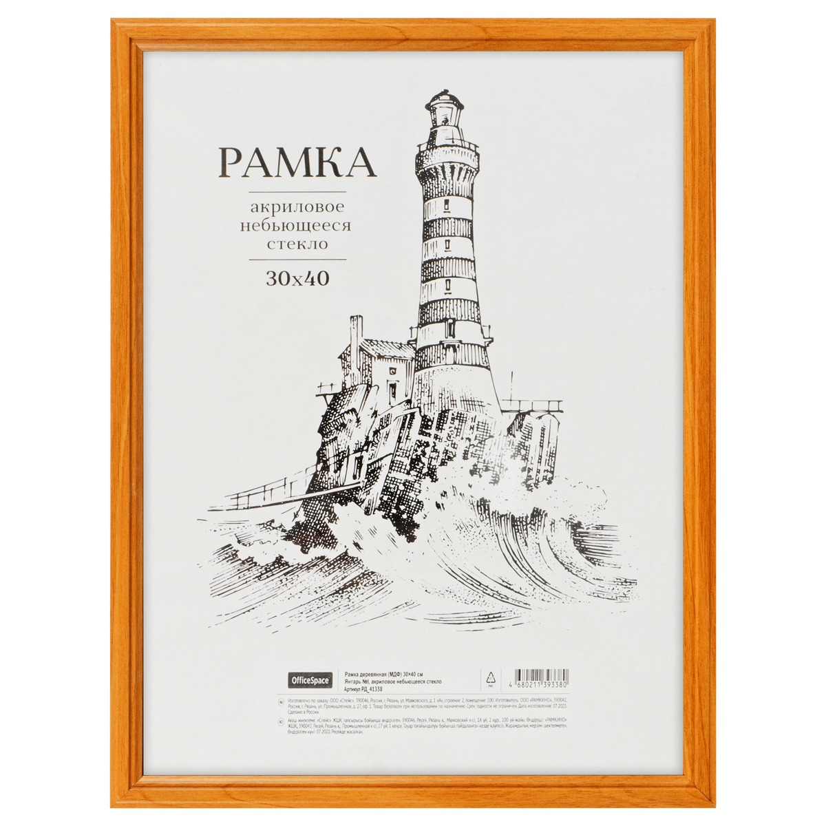 Рамка деревянная (МДФ) 30*40см, OfficeSpace, №1, акриловое небьющееся стекло, янтарь