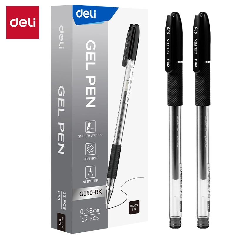 Ручка гелевая Deli 0,38мм, черная, игольчатый након, резиновый грип