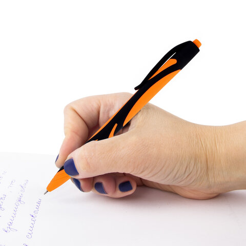 Имеет прорезиненный корпус броского дизайна. Представлена в пяти ярких неоновых цветах. Укомплектована стержнем синего цвета длиной 107 мм с игольчатым наконечником. Диаметр пишущего узла 0,7 мм создает линию письма, равную 0,35 мм. Цвет чернил – синий.