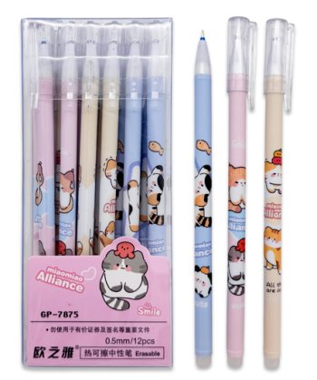 Ручка "Пиши стирай" в красочном корпусе. Чернила обесцвечиваются при трении. Достаточно потереть надпись резинкой, расположенной на конце ручки, и надпись исчезнет. При корректировке надписи бумага остается невредимой, можно писать поверх стертого.