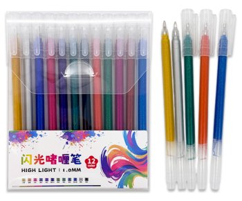 В наборе гелевые ручки 12 цветов с глиттером. Цветные гелевые ручки используются для выделения в тексте заголовков, определений и других элементов, на которые необходимо обратить внимание. С помощью этих ручек создаются декоративные надписи или рисунки.