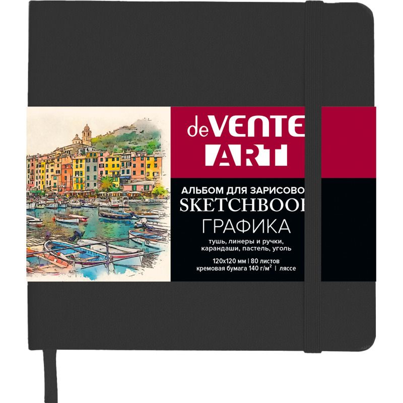 Скетчбук для рисования, скетчинга и записей А6 (120x120 мм) 80 листов "deVENTE. ART" кремовая бумага 140 г/м², твердая обложка из искусственной кожи soft touch, горизонтальная резинка, петля для ручки, ляссе, термоусадочная пленка, черный