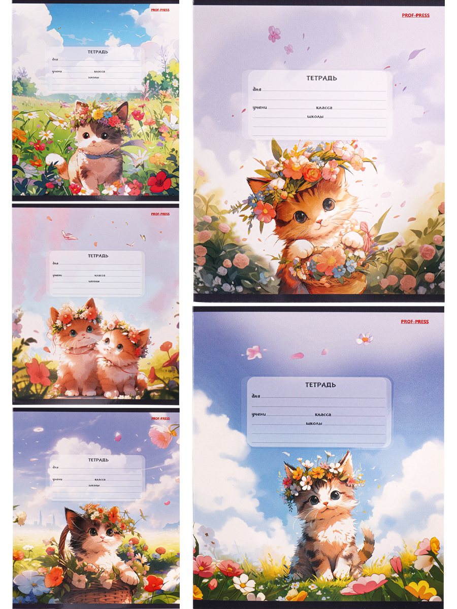 Тетрадь А5 12л лин. Проф-Пресс "Кошечки с цветами" твин-лак, 5диз.в спайке, белизна 100%