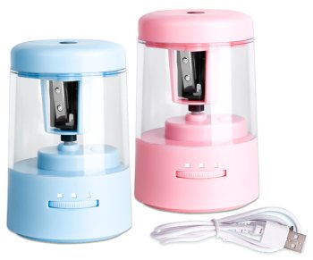 Точилка с цветным пластиковым корпусом и прочным прямым лезвием. Механизм приходит в движение при помощи электричества от батареек АА (в комплект не входят) или USB-провода (в комплекте). Затачивание начинается автоматически после помещения карандаша вну