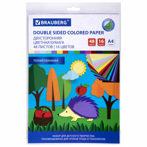 Цветная бумага А4 ТОНИРОВАННАЯ В МАССЕ, 48 листов 16 цветов, склейка, 80 г/м2, BRAUBERG, 113504